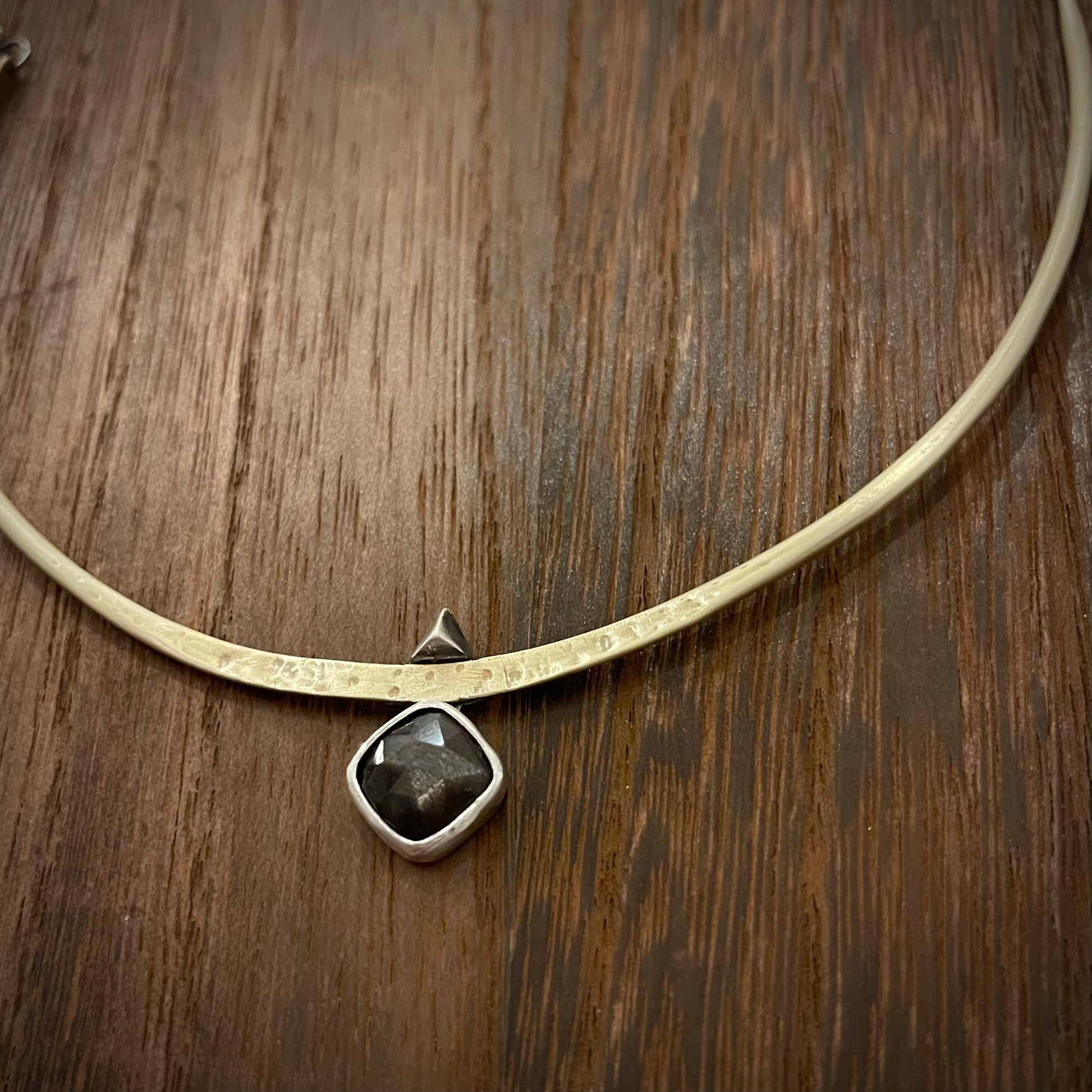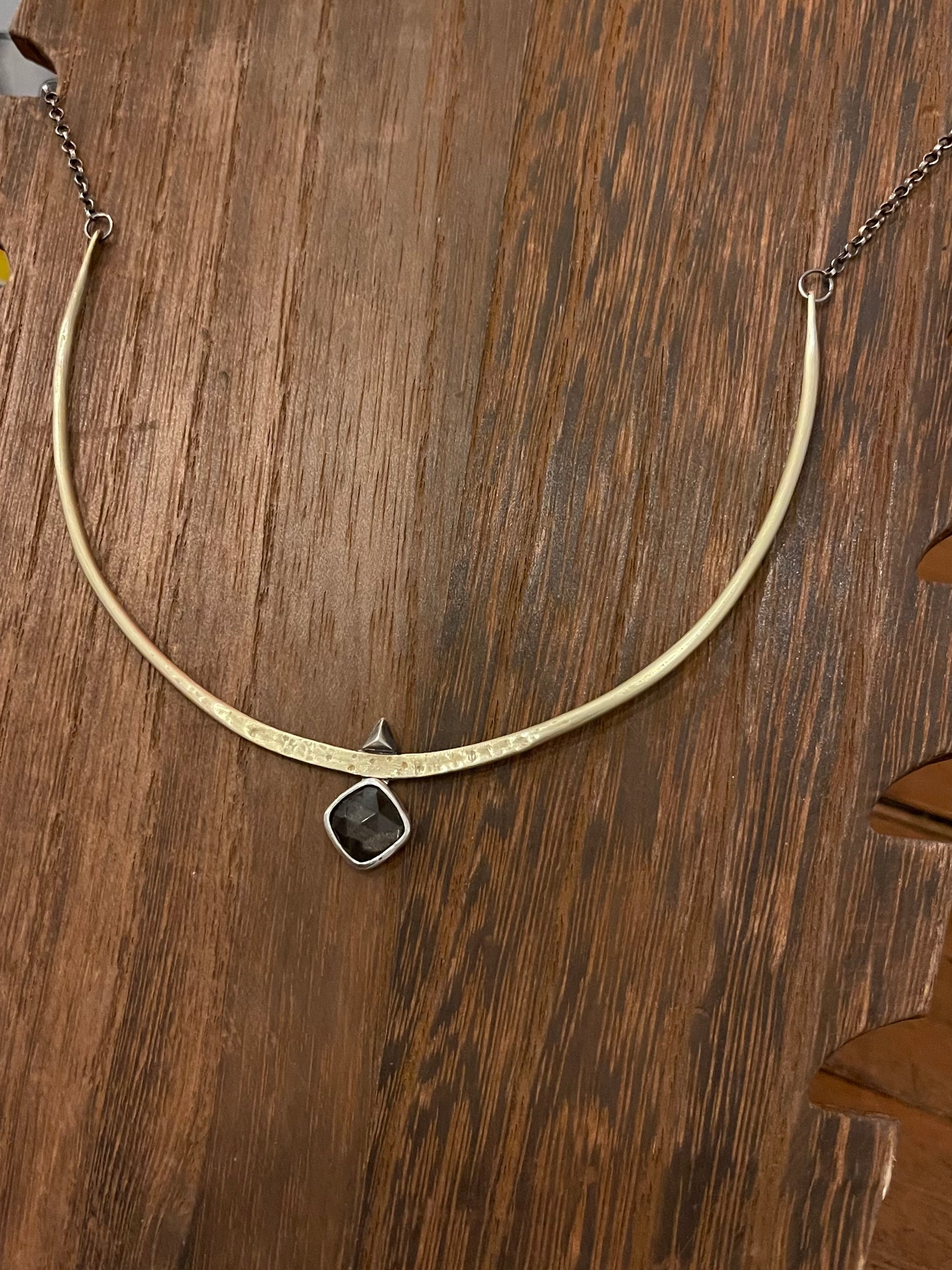 Designed to impress, this Black Fire Moonstone Neck Cuff is handmade with a beautiful black fire moonstone for eye-catching sparkle. The cuff is crafted with elegant brass and sterling silver for a timeless appeal that you'll love to show off.