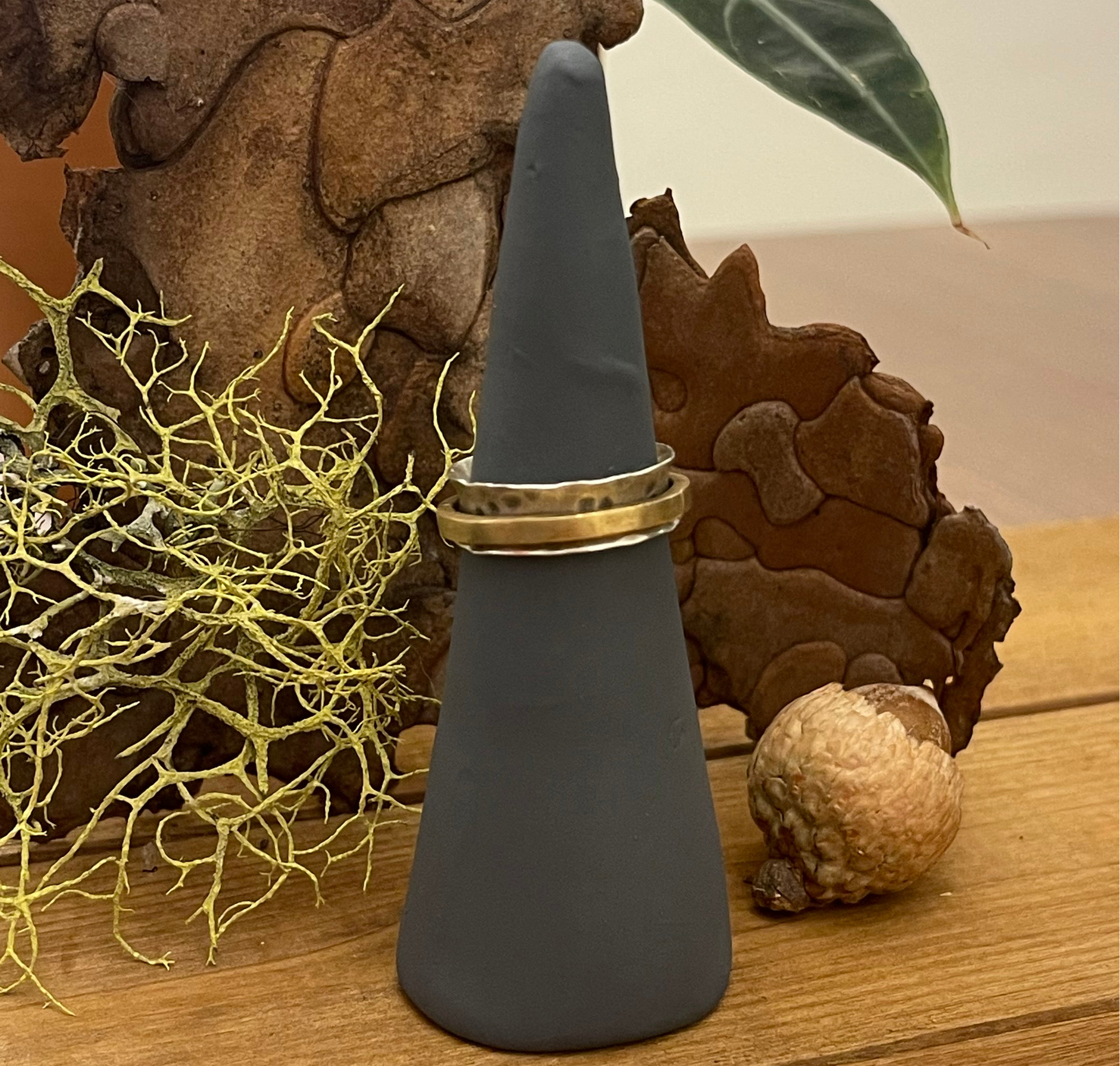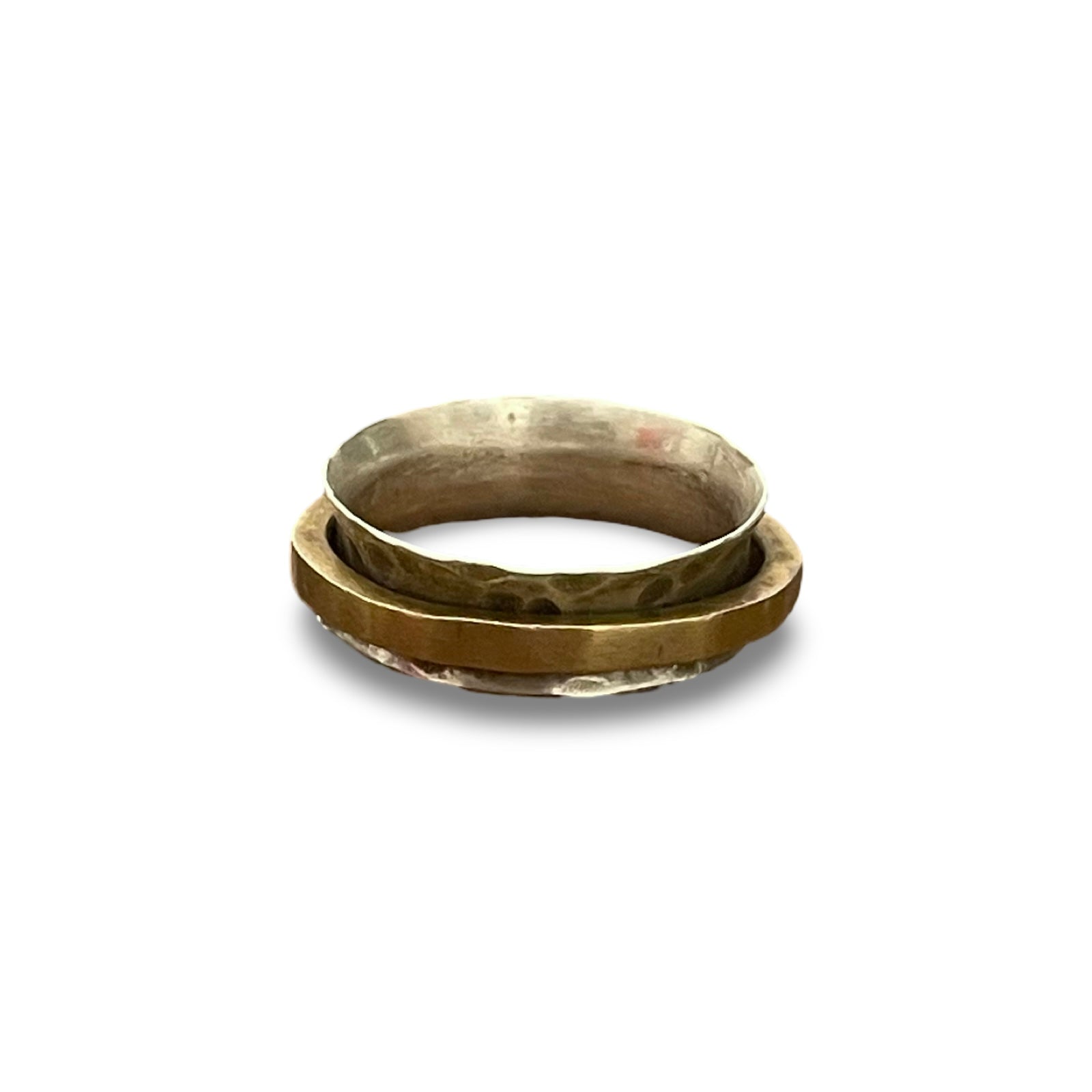 This elegant spinner ring is a beautiful blend of textures and metals. A wide, polished sterling silver band forms the base, complemented by a delicate brass ring that spins freely around it. The combination of the warm brass and cool silver creates a striking contrast, making this a versatile and timeless piece of jewelry.
