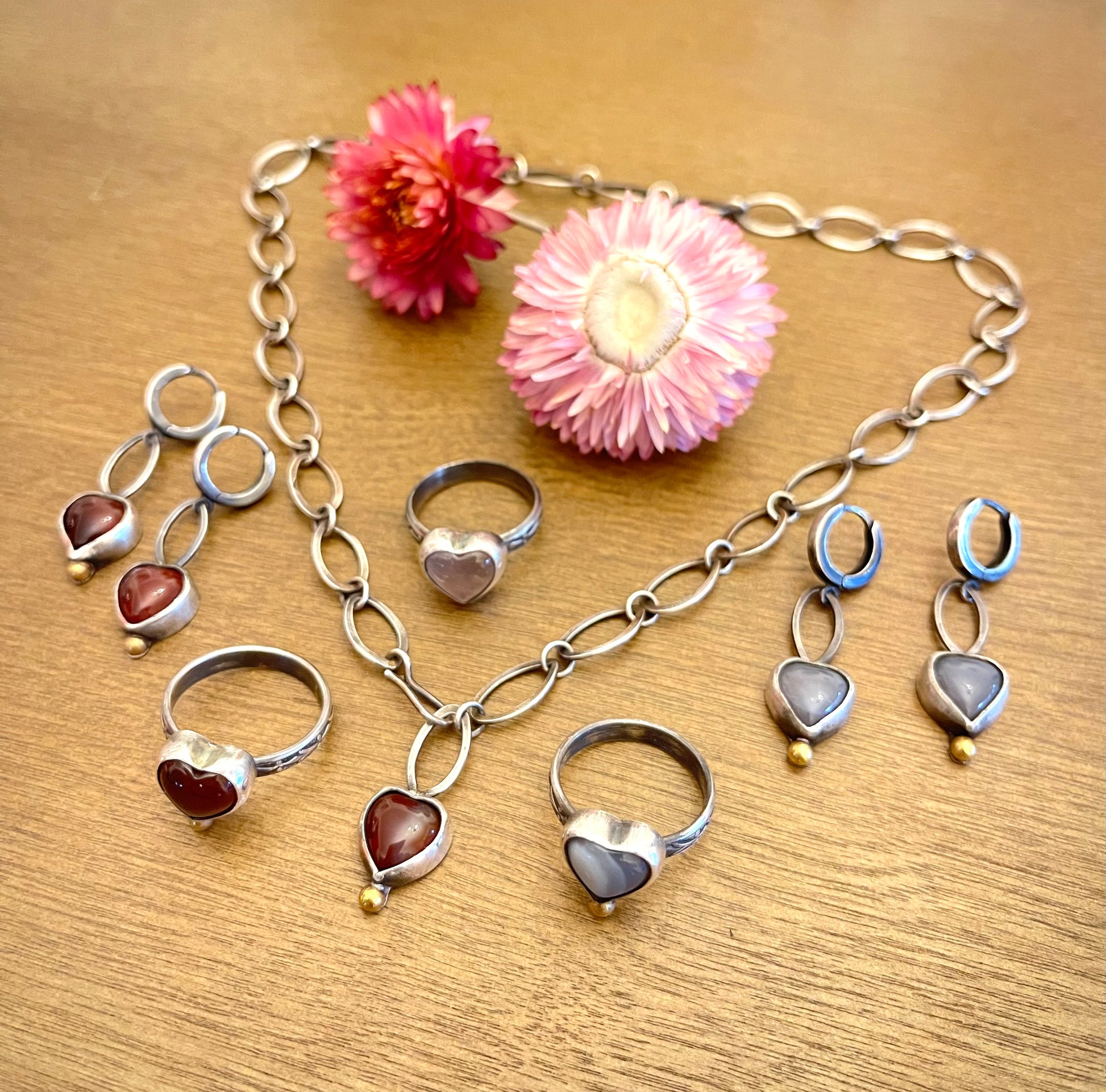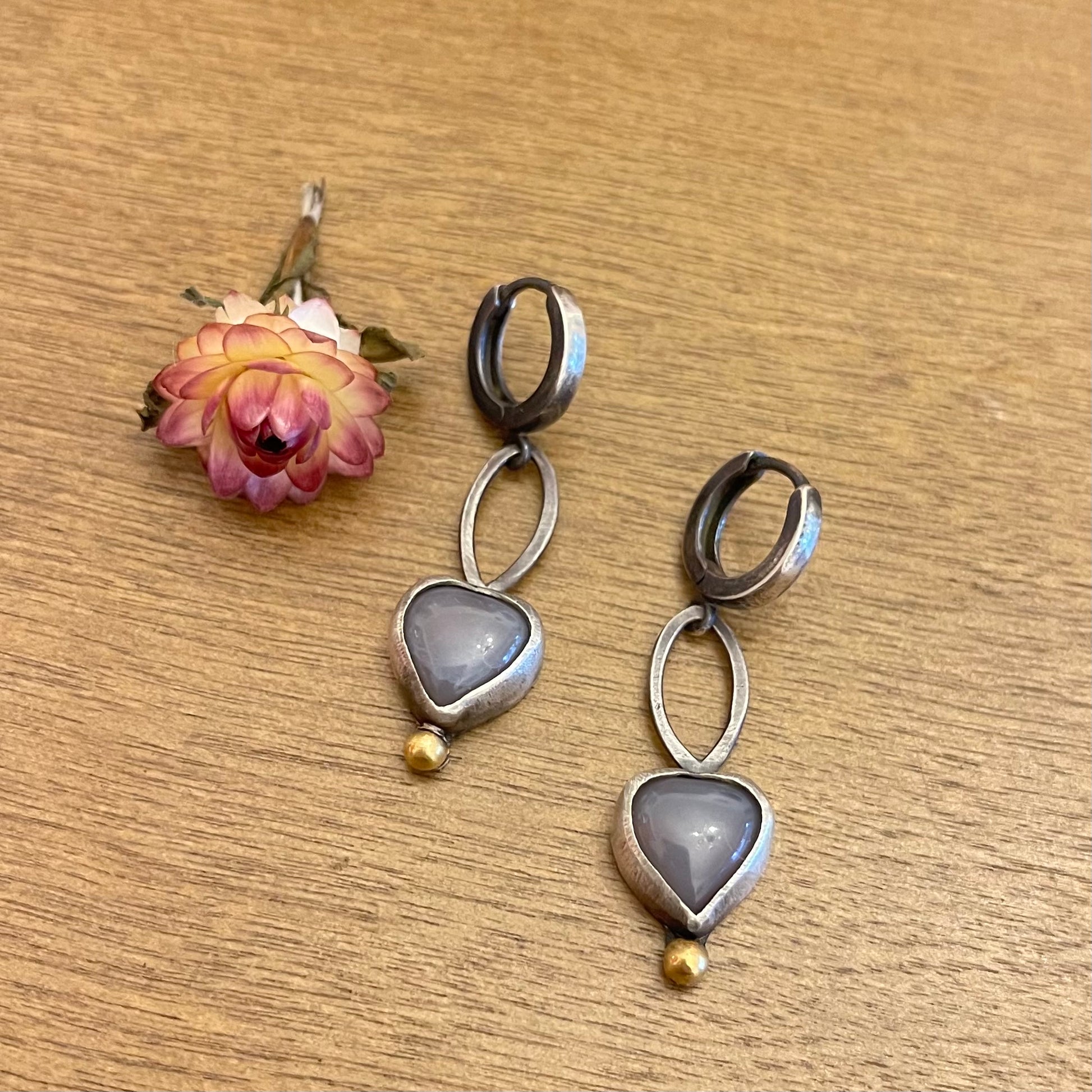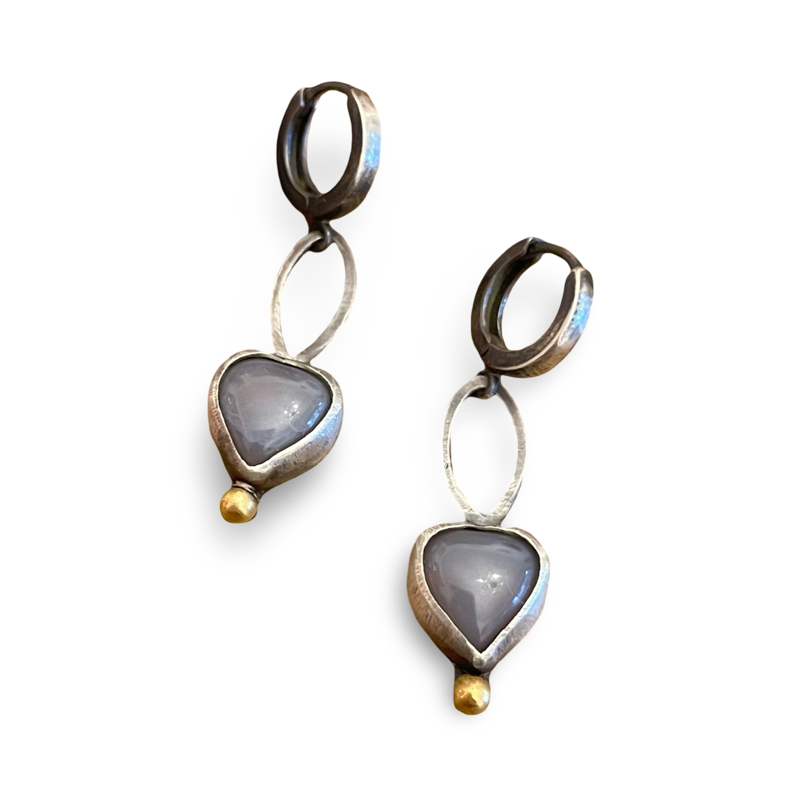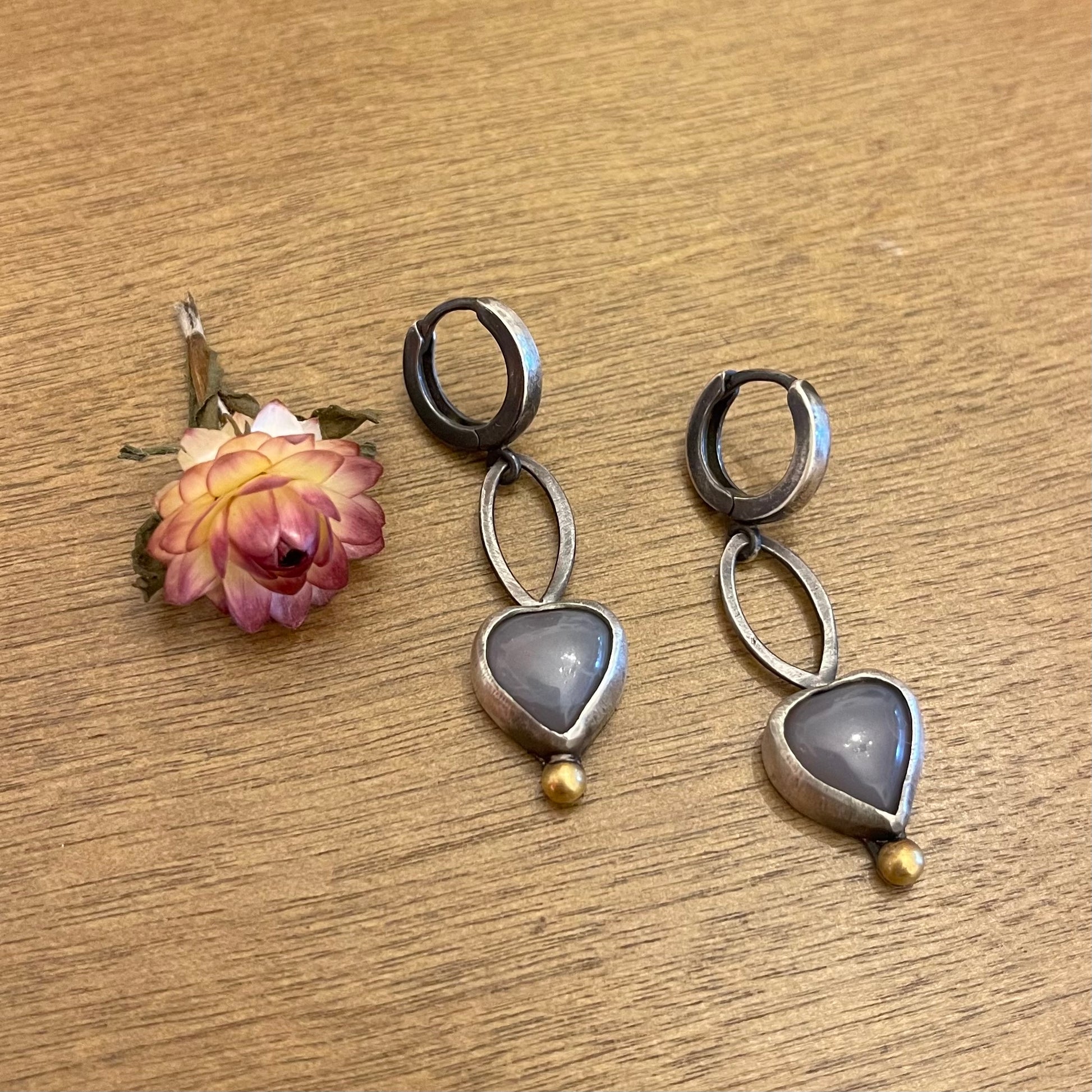 Gray Agate Heart Earrings These stunning earrings are made with sterling silver and a heart shaped gray agate stone. a stone that represents emotional healing, protection and balance. It hangs 1 inch from a huggie hoop earrings. The perfect earrings for that special occasion or everyday wear. Complete the look with a matching ring.