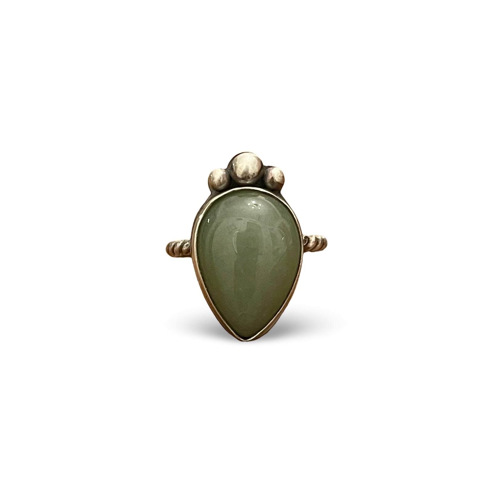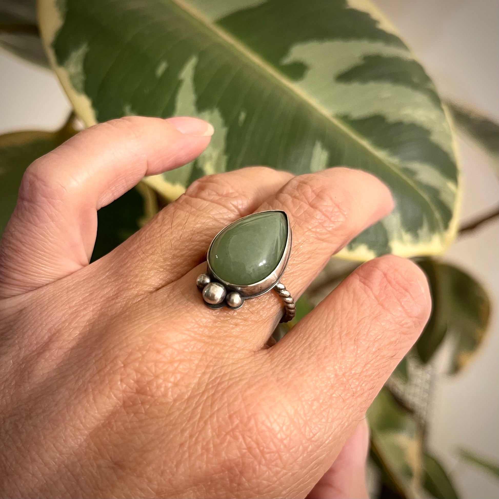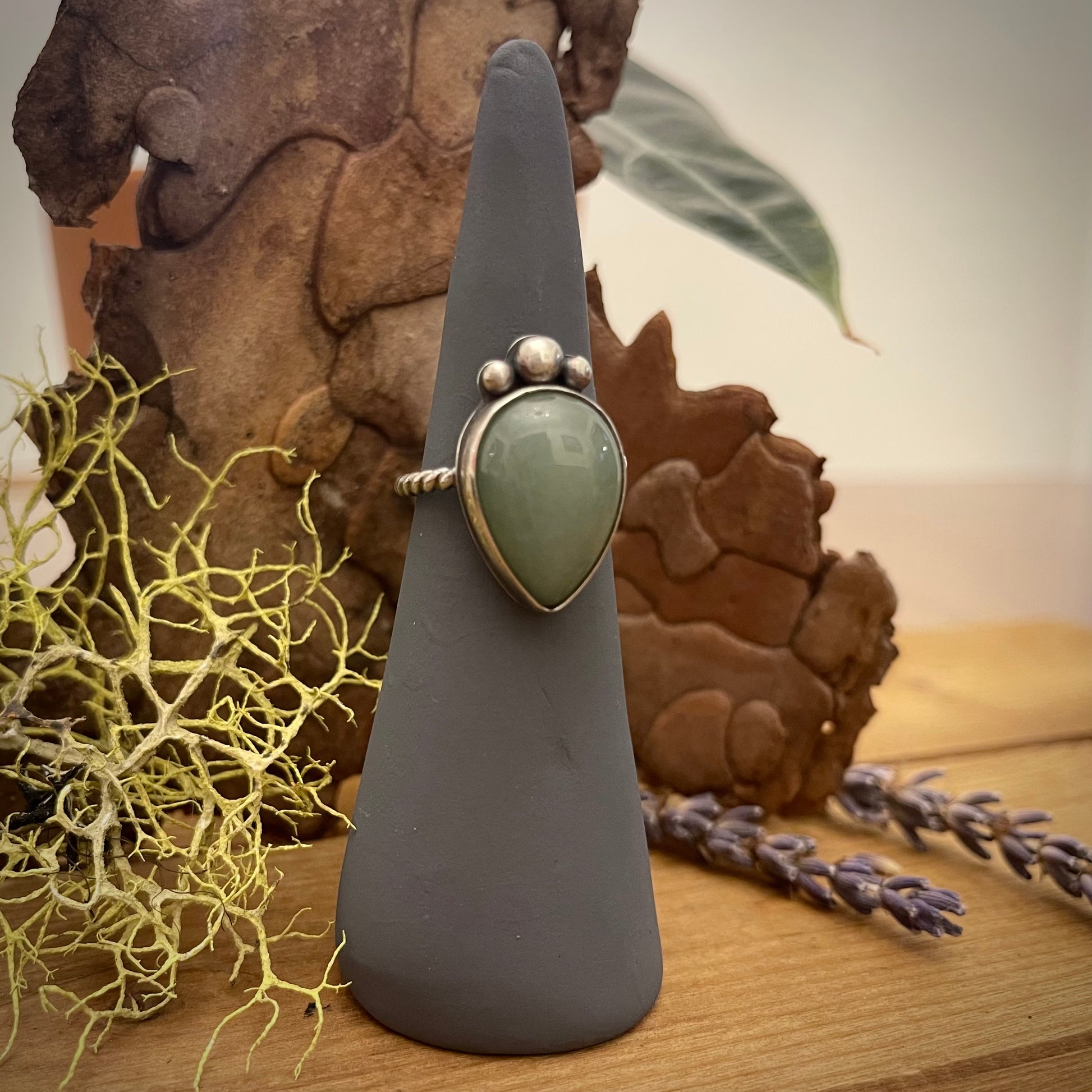Timeless and elegant, this sterling silver ring showcases a striking 20mm X 13mm teardrop-cut green aventurine stone. The smooth, light green stone is securely set in a classic bezel, accented by three silver bead details at the top. The polished silver band is beautifully designed with a twisted rope motif, creating a delicate yet durable look. This ring is a versatile piece perfect for everyday wear or as a thoughtful gift.