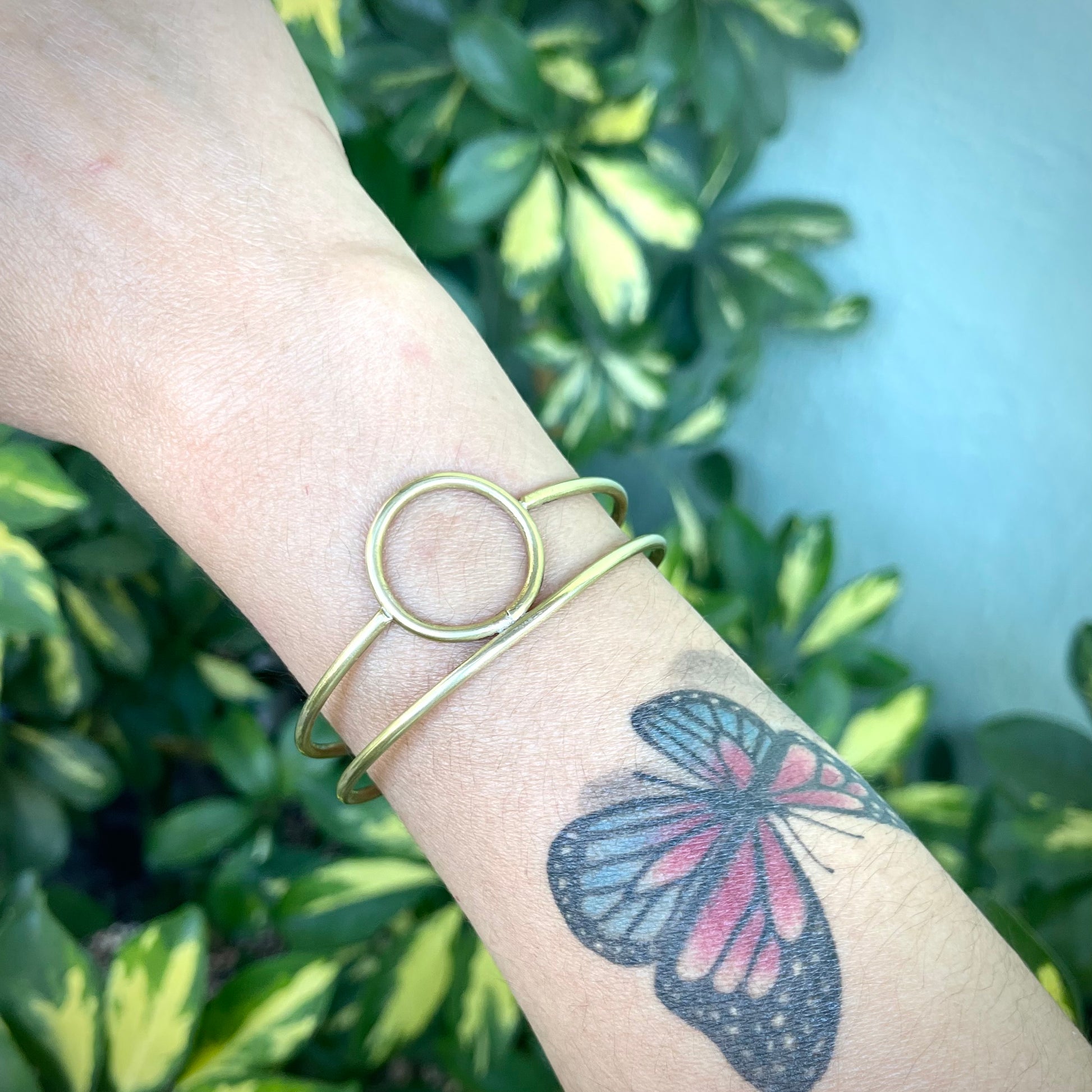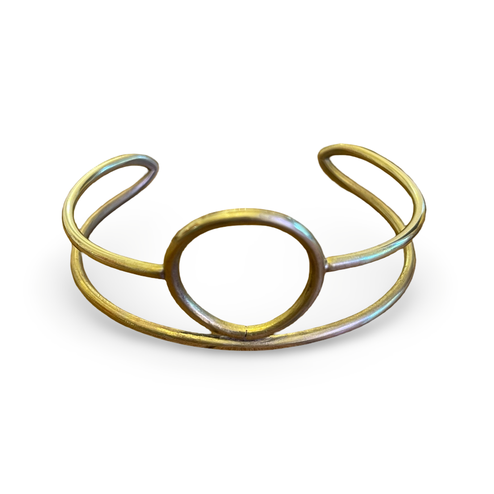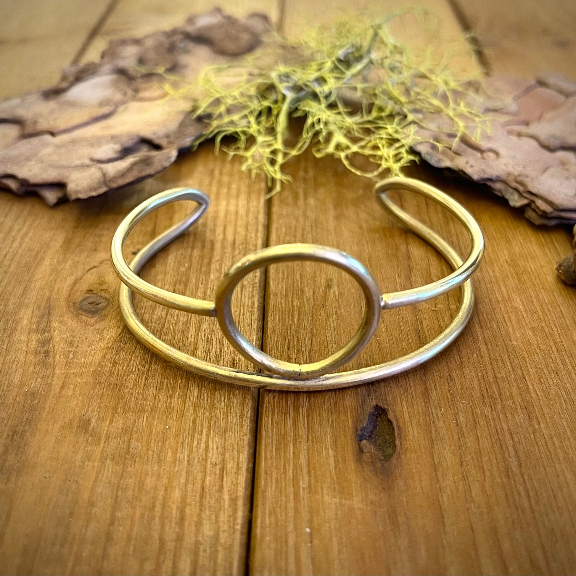 The elegant and minimalist design of this brass cuff makes it a versatile statement piece. Handcrafted from polished brass, the cuff features two parallel bands that curve around the wrist. The upper band is adorned with a perfectly formed open circle, adding a touch of modern artistry to the classic cuff shape.