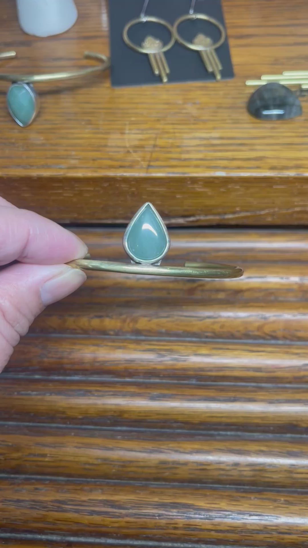 This lotus cuff features a faceted green aventurine stone set in sterling silver with a brass cuff with a lotus bulb detail on the back. The cuff is 2.5” width, size medium. This is a one of a kind piece.