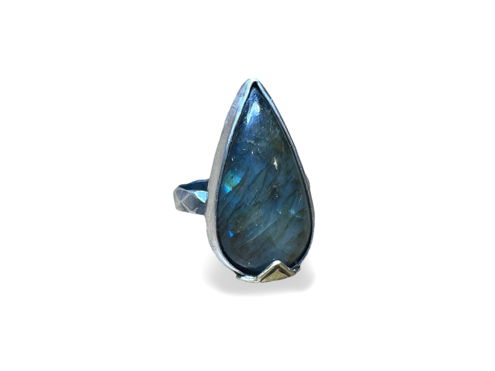 This oval labradorite ring features a 1.25” pear shape stone set in sterling silver. It has a quadruple ring shank and feels nice and snug on your finger. This is a one of a kind piece.