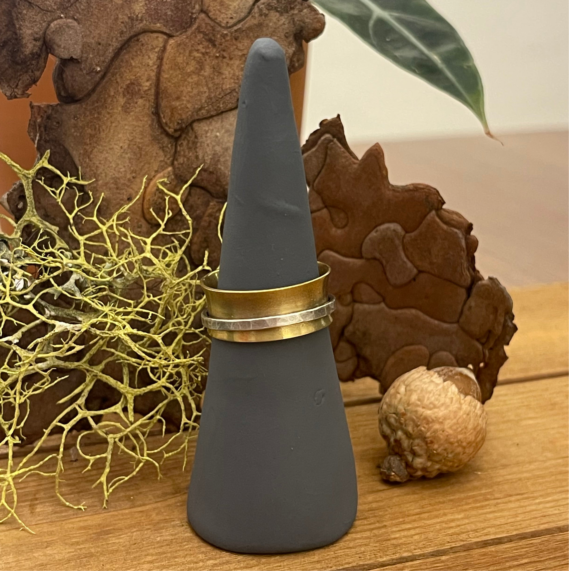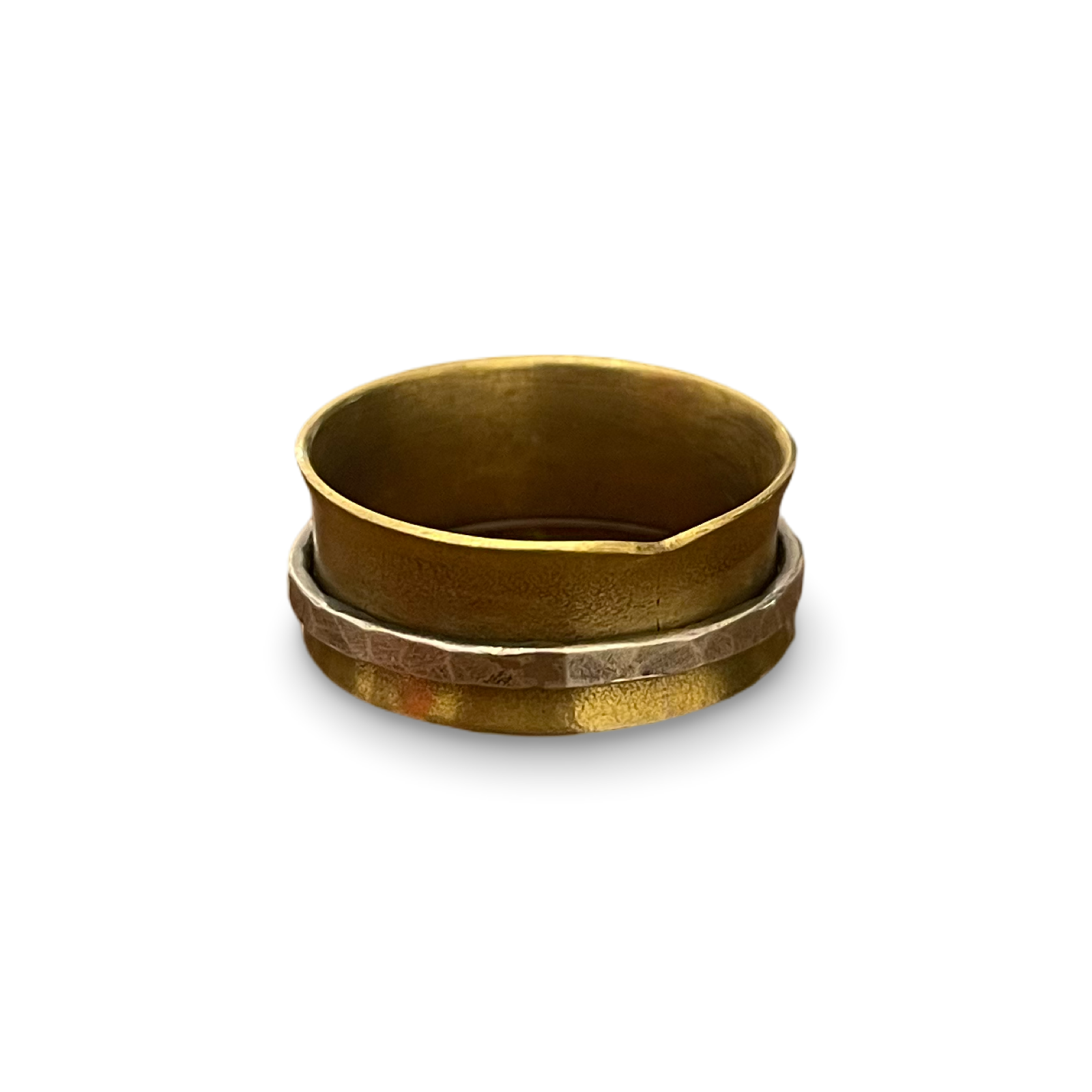 This elegant spinner ring is a beautiful blend of textures and metals. A wide, polished brass band forms the base, complemented by a delicate sterling silver ring that spins freely around it. The combination of the warm brass and cool silver creates a striking contrast, making this a versatile and timeless piece of jewelry.