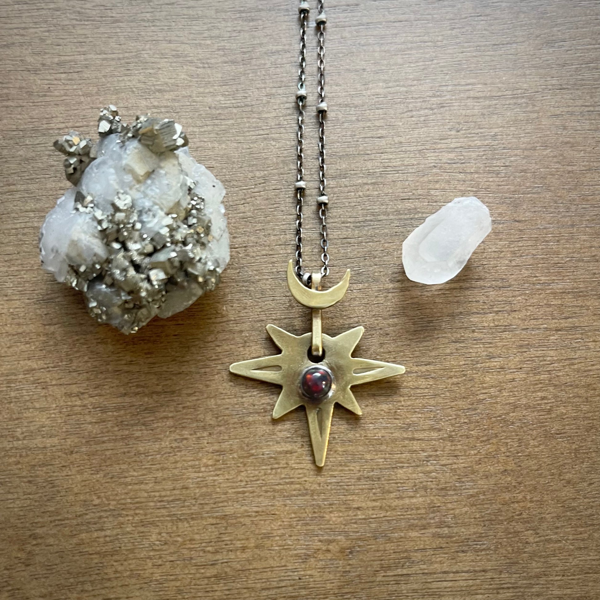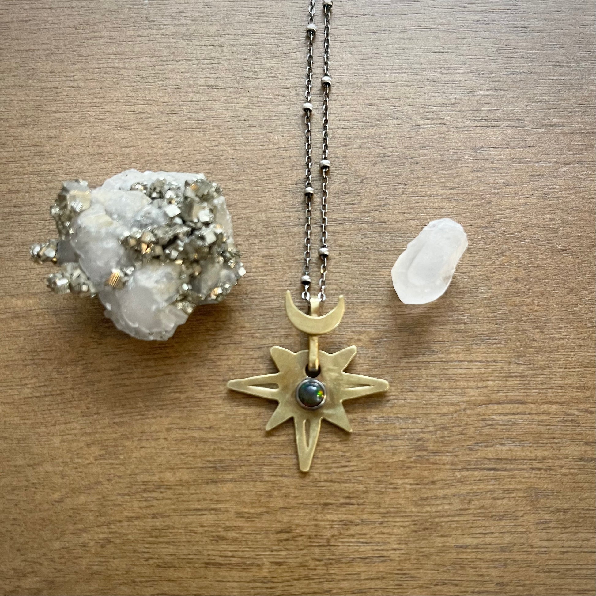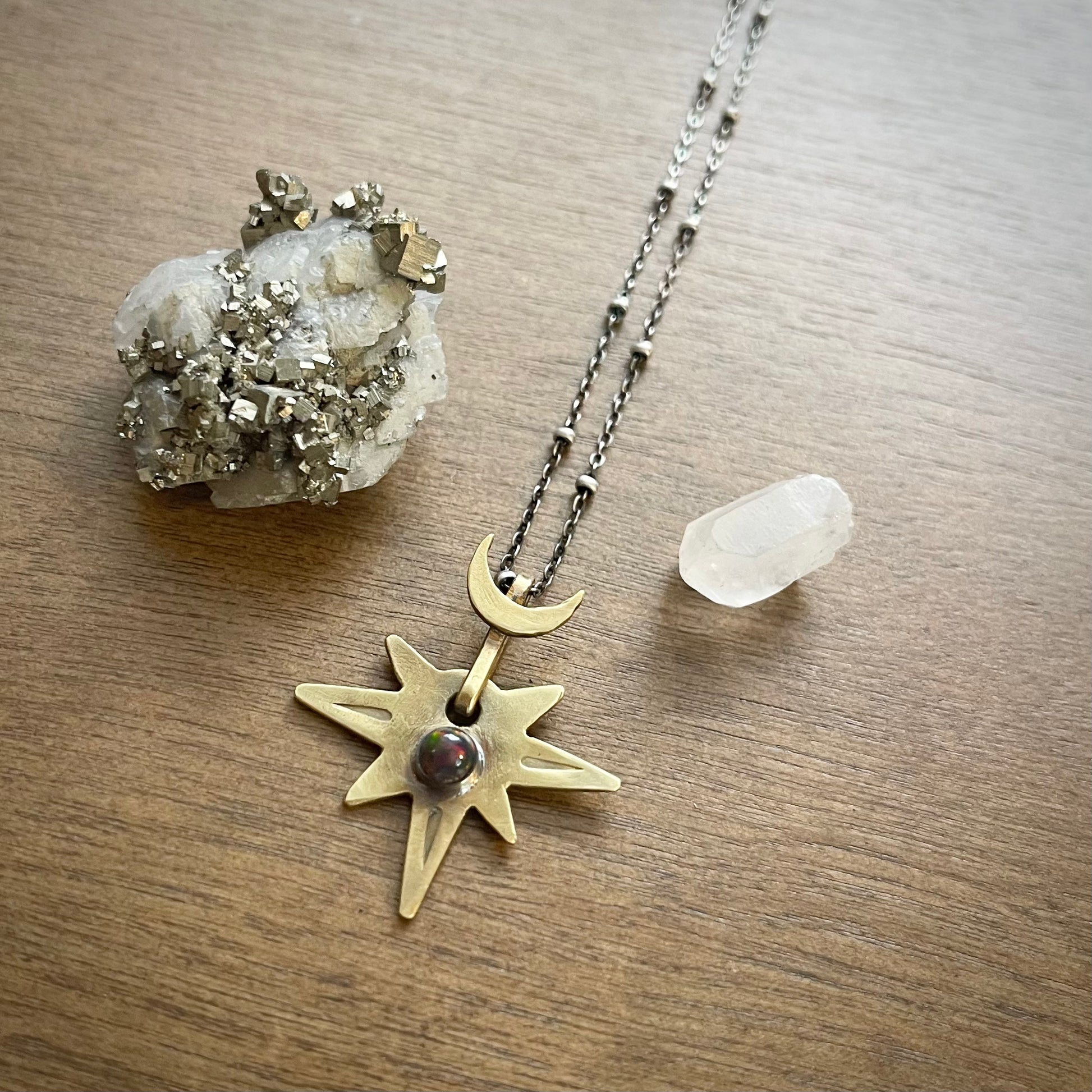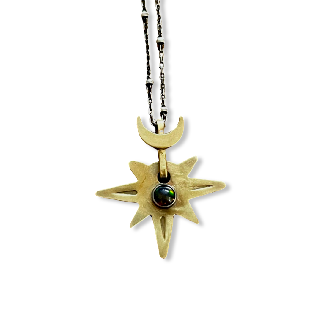 This unique and eye-catching necklace features a gorgeous starburst pendant encrusted with an Ethiopian opal gemstone and hung on a sterling silver beaded chain. Handcrafted and one of a kind, the Starburst Necklace is the perfect accessory for both formal and casual occasions.