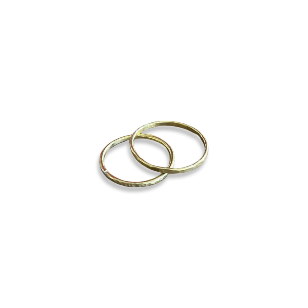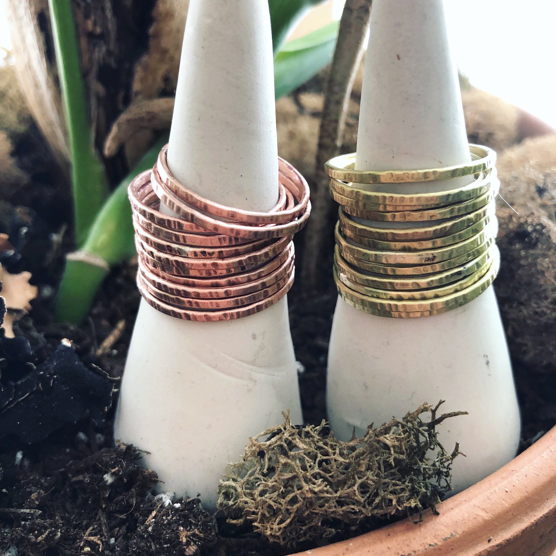 These stackable rings are my best sellers! Made with brass or copper, it is hammered to give texture and design. Wear them one at a time or stack them up with other rings.